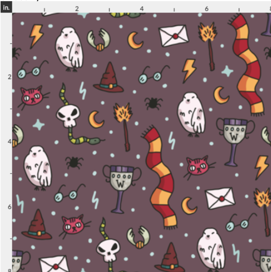 Search for iconic imagery on the aubergine (brownish purple) background and you will not be disappointed! White Owls, Broomsticks, and Lightning Bolts are among some of the artwork. You may even be lucky enough to catch a golden snitch! Solemnly Swear is paired with Black Canvas